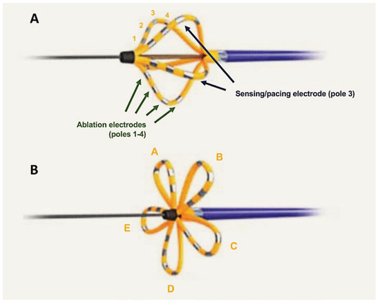 Pentaspline ablation catheter in basket (A) and flower (B) configuration.