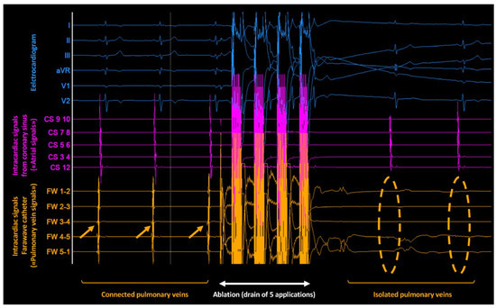 - Haïssaguerre, M.; Jaïs, P.; Shah, D.C.; Takahashi, A.; Hocini, M.; Quiniou, G.; et al. Spontaneous initiation of atrial fibrillation by ectopic beats originating in the pulmonary veins. N Engl J Med. 1998, 339, 659–666. [Google Scholar] [CrossRef]