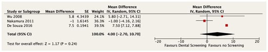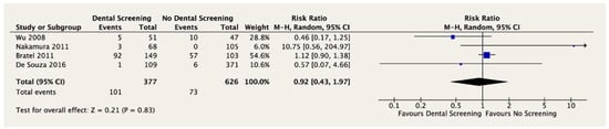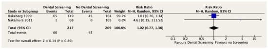 The rates of postsurgical infection were reported in two studies [10,13]. A pooled RR of 1.02 (95% CI 0.77–1.36) was calculated, with a very low certainty of evidence, suggesting that there are no significant difference in the rate of postsurgical infection between individuals who received dental treatment before heart valve surgery and those who did not (Figure 3). There was low heterogeneity between the studies (p = 0.89, I2 = 0%).
