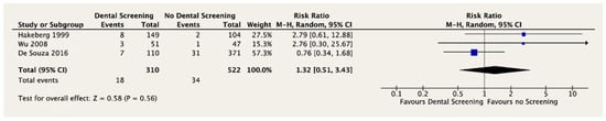 Among the studies included in our analysis, three investigations provided data on the rates of prosthetic valve infective endocarditis [9,12,13] The pooled estimate from these studies yielded a RR of 1.32 (95% CI 0.51–3.43), indicating a very low certainty of evidence (Figure 2). There was moderate heterogeneity between the studies (p = 0.56, I2 = 32%). The RR of 1.32 might suggest a potentially increased risk of developing prosthetic valve endocarditis for individuals who underwent dental clearance compared to those who did not, although the difference is not statistically significant.