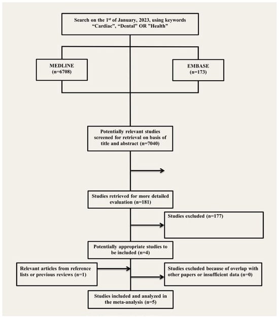 The MEDLINE, EMBASE and Cochrane databases were searched up to January 1, 2023 for full-length publications in English reporting on patients undergoing preoperative dental clearance before cardiac surgery. The search strategy is provided in the Supplementary Material (Figure S1). Because the data-sharing statements indicate confidentiality, authors were not contacted if the provided data was unclear. Studies by the same author, except for guidelines, letters, position papers, consensus statements and reviews, were included. First, the title and abstract were reviewed, then the remaining articles were reviewed in depth. Relevant articles identified by cross-referencing were added manually to ensure that no relevant studies were missed. A study was included if: (i) the patients were preoperatively screened; (ii) it included any outcomes after any type of predefined cardiac surgery; and (iii) the participants were adults.