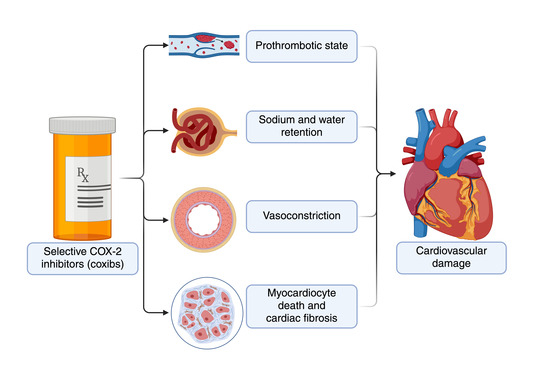 Coxibs came into existence in 1990 with the sole purpose of producing an anti-inflammatory effect without gastrointestinal or renal side effects [4,6]. However, multiple studies have now confirmed that, despite their anti-inflammatory effect, coxibs may increase cardiovascular side effects. The inhibition of COX-2 by coxibs is strongly linked to prothrombotic, renal, molecular, and genetic mechanisms which translate into an increased prothrombotic state, sodium and water retention, vasoconstriction increase and vasodilation decrease, vascular damage, direct harm to the myocardium, cell death, and cardiac fibrosis. These increase the cardiovascular risks of systemic arterial hypertension, heart infarction, stroke, and sudden death. The cardiovascular-related risks posed by coxibs are often overlooked in medical practice; these drugs are commonly prescribed for pain, with a focus on gastric and renal protection, without considering potential cardiovascular damage in patients who already have risk factors for cardiovascular diseases. We hope that this review encourages further reflection on the adverse effects of coxibs, so that the potential harm a patient might undergo when prescribed them is considered.