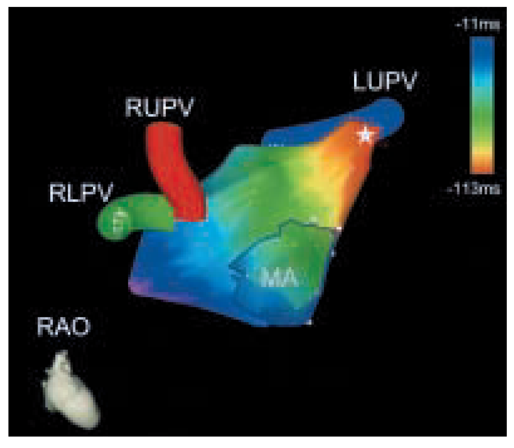 Abb. 2). Dabei zeigte sich der Ursprung der fokalen Tachykardie im Bereich der Spitze des linken Vorhofohrs, wo diese erfolgreich abladiert werden konnte (