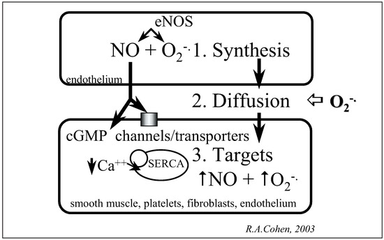 Vascular disease in diabetes is accompanied by decreased levels of the vasodilators, nitric oxide (NO) and prostacyclin, and increased levels of vasoconstrictor eicosanoids, which enhance the progression of the disease. The vascular dysfunction caused by short term exposure to elevated glucose and the long term effects of diabetes are similar, suggesting that the alteration in endothelial factors in diabetes primarily results from exposure of endothelial cells to elevated glucose. Undoubtedly hyperlipidaemia contributes as well. Increased formation of reactive oxygen species is an important feature of the diabetic endothelial cell phenotype. This results in part from uncoupling of endothelial nitric oxide synthase such that it generates superoxide anion in addition to NO, forming peroxynitrite, a damaging molecule. Peroxynitrite inactivates prostacyclin synthase leading to the accumulation of inflammatory and prothrombotic eicosanoids. This not only helps to explain the impairment of endothelial vasodilator mechanisms, but also increased progression of vascular disease. Many of these cellular abnormalities can be prevented by adequate scavenging of oxygenderived free radicals or by blocking the actions of the eicosanoids at TP receptors. Exposure to elevated glucose also gives rise to oxidants in smooth muscle, and recent studies indicate that oxidation of cysteine thiols under these conditions may prevent physiological NO signaling. As a result the responsiveness to NO is impaired and accounts in part for abnormal endotheliumdependent vasodilatation. Full article