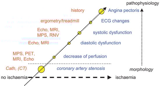 Eine stumme Ischämie liegt dann vor, wenn eine Ischämie bei asymptomatischen Patienten objektiv nachgewiesen wird. Die Angina pectoris als Symptom stellt lediglich die Spitze des Eisbergs in der ischämischen Kaskade dar (Figure 1). Vorab findet sich bei einer hämodynamisch relevanten Koronarstenose eine Minderperfusion des Myokards. Diese bewirkt nach metabolischen Veränderungen eine Beeinträchtigung der diastolischen und systolischen Funktion. Im weiteren zeitlichen Ablauf können EKG-Veränderungen und zuletzt dann eine Angina-pectoris-Symptomatik auftreten. Die Suche der stummen Ischämie kann mittels verschiedener Tests erfolgen (Ergometrie, myokardiale Perfusionsszintigraphie [MPS], Stress-Echokardiographie, Magnetresonanz-Tomographie [MRI], Positron-Emissions-Tomographie [PET], Radionuklidventrikulographie [RNV]) (Figure 1).