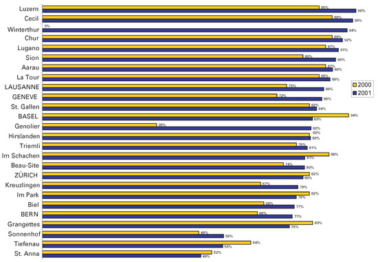 A national annual survey of cardiac procedures (percutaneous and surgical) is carried out since 1987, using a standardized questionnaire. We present the data of the year 2001 about percutaneous interventions for every center in the country, be it of the public academic, public non academic, or private sector. A total of 30454 coronary angiographies (+0.2% compared with 2000), 11803 percutaneous coronary interventions (PCI) (+6%) were performed during the year 2001 in the 26 Swiss centers (5 university hospitals, 10 public non university hospitals and 11 private clinics). Diagnostic studies resulted in percutaneous revascularization in 39% of cases, 73% of PCI were performed at the time of the diagnostic study (ad hoc), 87% were single vessel PCI, and 11% were performed during acute myocardial infarction (AMI). Stents were implanted in 82% of cases (drug eluting 0.3%), glycoprotein IIb/IIIa antagonists were used in 22% of cases (important variability among centers). Other techniques were relatively rarely used: brachytherapy (2%), sonotherapy (0.6%) and Rotablator (0.3%). Laser angioplasty, directional atherectomy and laser wire recanalization were barely used (<0.1%). Distal protection devices were used in 2.8% of the cases. Additional diagnostic tools like intracoronary (ic) pressure (2%), ic Doppler (1.4%), ic ultrasound (2.5%) were used, but exceptionally. The average case load for the 175 operators performing diagnostic studies was 174 cases per year while the case load for the 113 interventionalists was 104 interventions per year. Reported intra-hospital PCI related mortality was 0.5%, PCI related AMI incidence 0.9% and emergency coronary aortic bypass graft incidence 0.1%. The following non coronary percutaneous procedures were reported: 15 alcohol ablations for septal hypertrophy, 28 mitral, 14 aortic, and 14 pulmonary valvuloplasties, 43 closures of patent ductus arteriosus (PDA), 154 closures of patent foramen ovale (PFO), 47 closures of atrial septal defects (ASD), 2 closures of ventricular septal defects (VSD), and 5 aortic coarctation angioplasties. Of all the procedures (coronary and non coronary), 38% were performed at the university hospitals. Full article