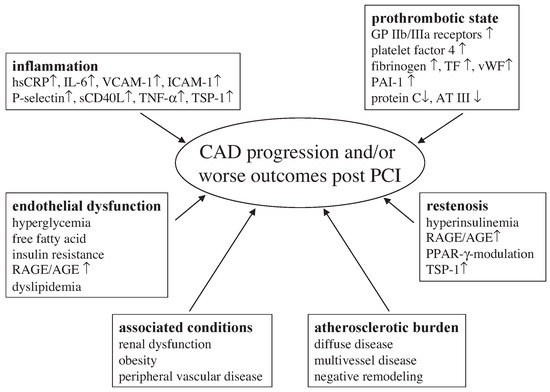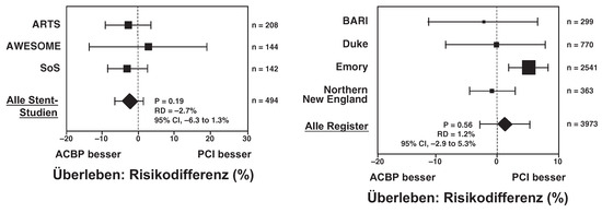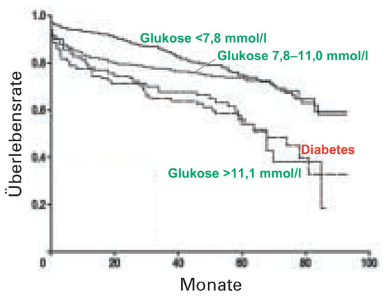 The definition of metabolic syndrome includes the presence of at least three of the following criteria: dyslipidaemia, hyperglycaemia, hypertension, and obesitas. The risk for cardiovascular events is strongly elevated in patients with metabolic syndrome. Also in acute myocardial infarction, hyperglycaemia worsens the outcome to a comparable degree as in patients with established diabetes. Infusion of insulin, glucose, and potassium reduces the risk for cardiac events. Glycoprotein IIb/IIIa antagonists lower the mortality in diabetic patients after percutaneous coronary intervention for acute coronary syndrome to the level of nondiabetics. In stable coronary artery disease, the mode of coronary revascularisation has been the subject of controversies. Recent clinical trials demonstrate equal mortality outcomes after percutanous and surgical revascularisation. Drug-eluting stents reduce the restenosis rate even in small vessels and long lesions as often present in diabetic patients. Drug therapy in patients with diabetes includes aspirin, statins, and inhibitors of the renin-angiotensin system––-even for primary prevention of cardiovascular disease. Full article