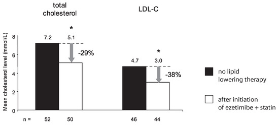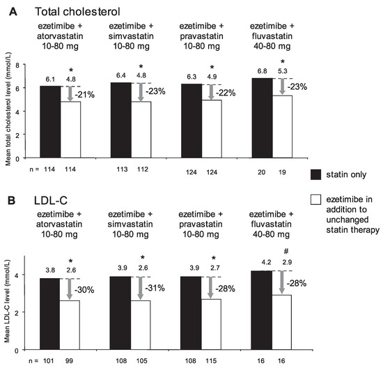 Background: Ezetimibe impairs the intestinal absorption of dietary and biliary cholesterol and has been shown to significantly decrease low-density-lipoprotein-cholesterol (LDL-C) levels either as a monotherapy or when co-administered with a statin. Aim: The aim of the present analysis of the observational [...] Read more.