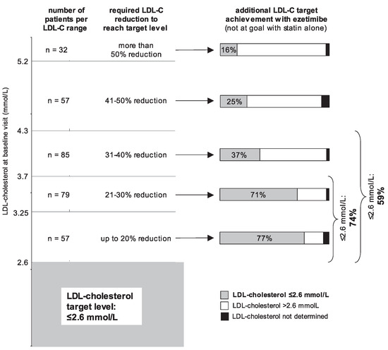 Background: Ezetimibe impairs the intestinal absorption of dietary and biliary cholesterol and has been shown to significantly decrease low-density-lipoprotein-cholesterol (LDL-C) levels either as a monotherapy or when co-administered with a statin. Aim: The aim of the present analysis of the observational program was to assess the efficacy of ezetimibe co-administered with statins in patients at high-risk for coronary artery disease (CAD) in daily practice. Methods: In outpatients with hypercholesterolemia either a combined lipid-modifying therapy consisting of ezetimibe (10 mg) and a statin (varying dose) was initiated for those not currently on statin therapy, or ezetimibe was added to previously established statin therapy. Total cholesterol (TC), LDL-C, highdensity- lipoprotein-cholesterol (HDL-C), and triglycerides (TG) before initiation of ezetimibe (baseline) and after an individual treatment duration (follow-up visit) were assessed by the treating physician. Results: There were 601 patients classified as high-risk according to the guidelines of the Working group Lipids/Atherosclerosis of the Swiss Society of Cardiology (WGLA/SSC). In 52 of these patients the newly initiated therapy consisting of ezetimibe and a statin resulted in a mean TC reduction from 7.2 to 5.1 mmol/L (–29%; p < 0.001) and a mean LDL-C reduction from 4.7 to 3.0 mmol/L (–38%; p < 0.001) after a treatment duration of 45 ± 21 days. In 374 high-risk patients the coadministration of ezetimibe with ongoing unchanged statin therapy resulted in an additional TC reduction of 21 to 23% (p < 0.001 for all statins) and an additional LDL-C reduction of 28 to 31% (p < 0.001 for atorvastatin, simvastatin, pravastatin; p = 0.001 for fluvastatin) depending on the statin used after a treatment duration of 57 ± 49 days. On average, TC levels decreased from 6.3 to 4.9 mmol/L and LDLC levels from 3.9 to 2.7 mmol/L. Of 310 highrisk patients not achieving a LDL-C level of ≤2.6 mmol/L with statin monotherapy and requiring up to 40% LDL-C reduction 59% reached this goal after an 8-weeks period of co-administration therapy with ezetimibe and a statin. Conclusions: Co-administration of ezetimibe and a statin is highly efficacious in patients with CAD and/or diabetes mellitus. The significant results of randomised trials can also be seen in daily practice in a typical outpatient setting. Full article