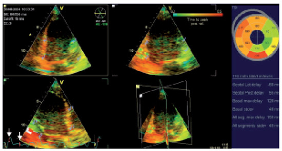 - Schuster, P.; Faerestrand, S.; Ohm, O.J. Color Doppler tissue velocity imaging can disclose systolic left ventricular asynchrony independent of the QRS morphology in patients with severe heart failure. Pacing Clin Electrophysiol 2004, 27, 460–467. [Google Scholar] [CrossRef]