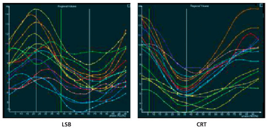 Segmentale Analyse des LV-Kontraktionsablaufes auf der Grundlage dreidimensionaler Echo-Daten. Die linke Graphik zeigt für die 16 LV-Segmente farbkodierte Verlaufskurven des Volumens über den Herzzyklus bei einem Patienten mit einem Linksschenkelblock, die rechte Seite die entsprechenden Volumen-Zeit-Kurven des gleichen Patienten unter CRT. Schon mit dem blossen Auge ist der deutlich harmonischere (synchrone) Kontraktionsablauf unter CRT-Bedingungen erkennbar.