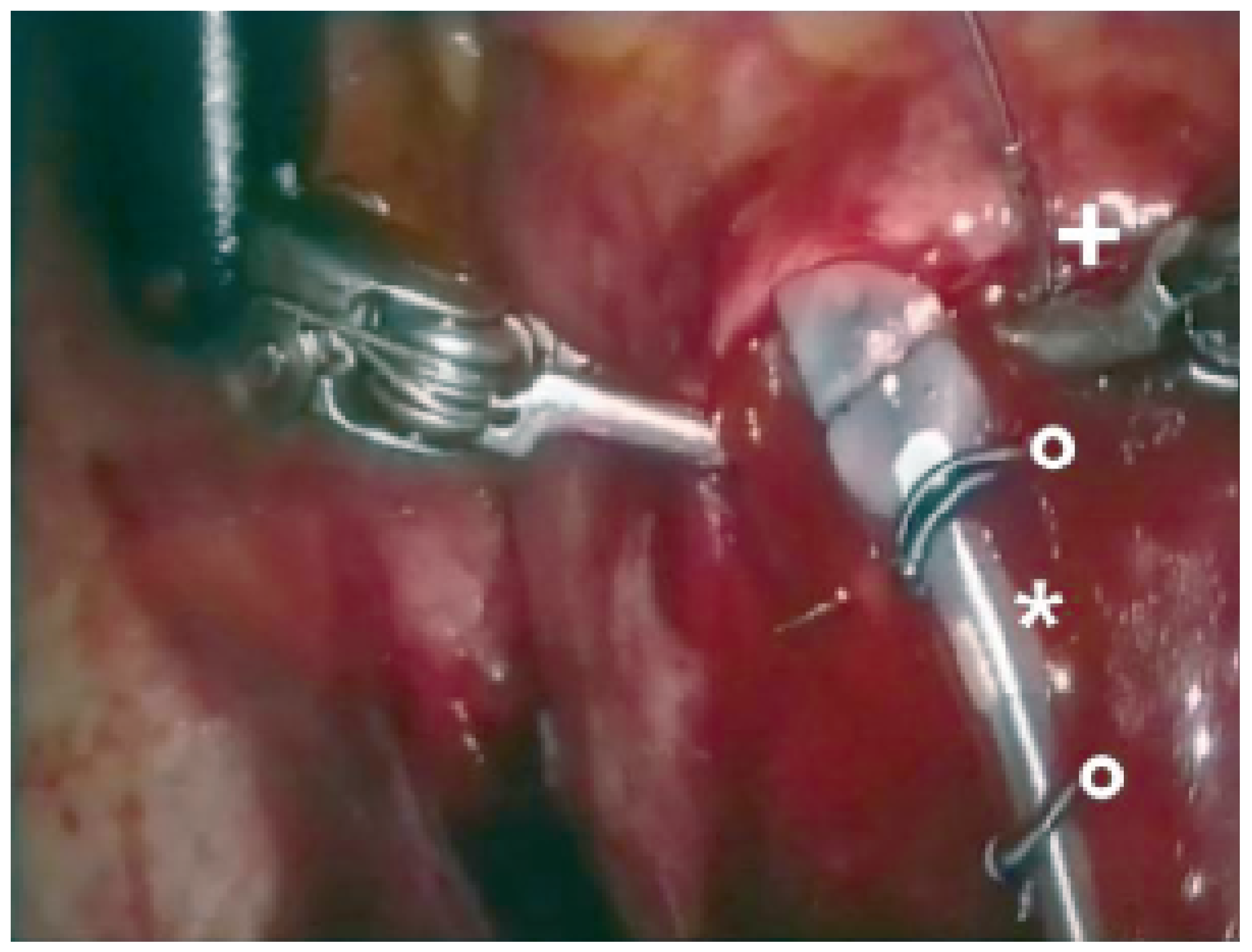 Roboter-unterstützte Fixierung der epikardialen Elektrode (*) mittels U-Clip (+). Die Elektrode wurde bereits an zwei Orten mittels U-Clips fixiert (°).