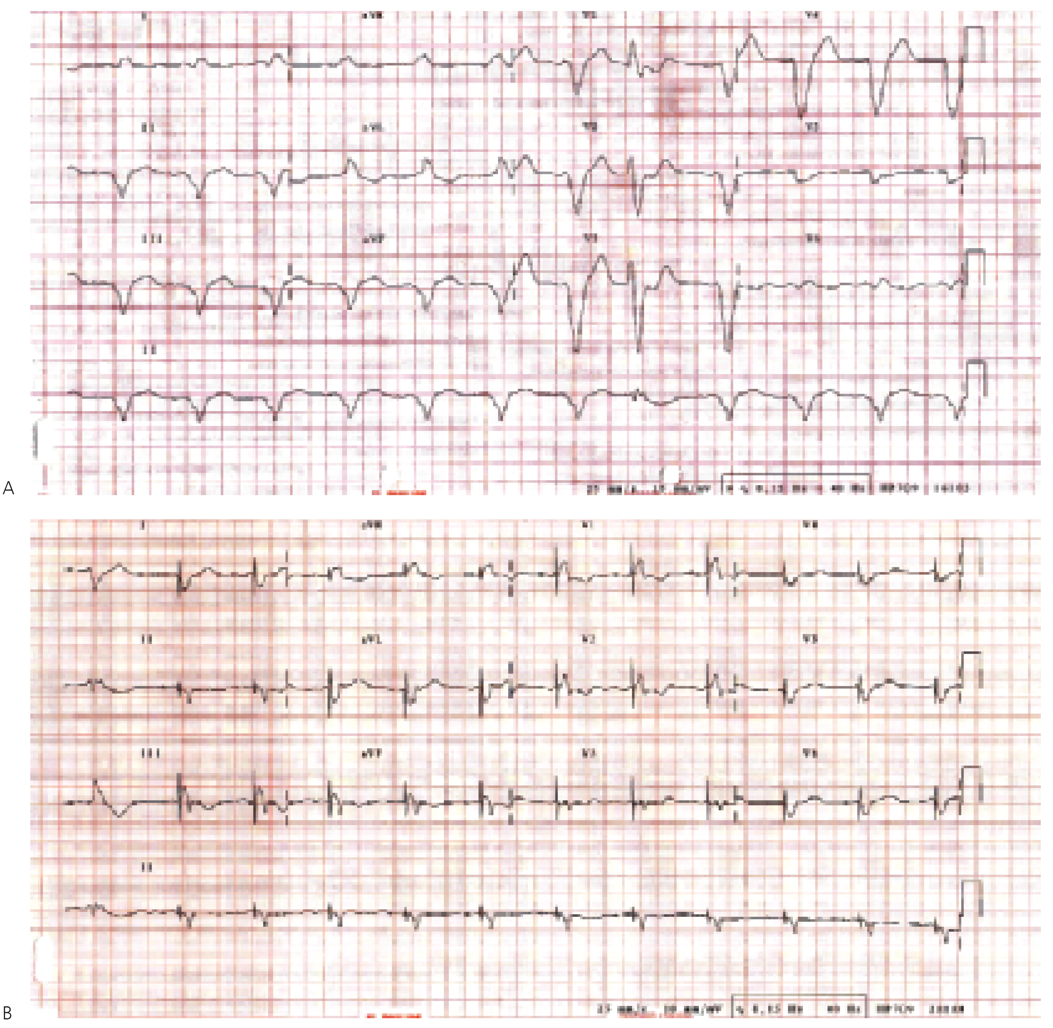 A Präoperatives EKG. Deutlich sichtbar ist die rechtsventrikuläre Stimulation. B Postoperatives EKG. Im Unterschied zum präoperativen EKG ist nun die biventrikuläre Stimulation deutlich sichtbar.