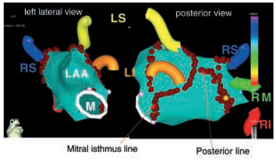 - Jais, P.; Weerasooriya, R.; Shah, D.; Raybaud, F.; Scavee, C.; Macle, L.; et al. Left atrial isthmus ablation: technique and results in patients with atrial fibrillation. Circulation 2002, 106, II–501. [Google Scholar]