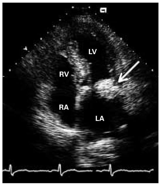 - Zuber, M.; Oechslin, E.; Jenni, R. Echogenic structures in the left atrioventricular groove: diagnostic pitfalls. J Am Soc Echocardiogr 1998, 11, 381–386. [Google Scholar] [CrossRef] [PubMed]