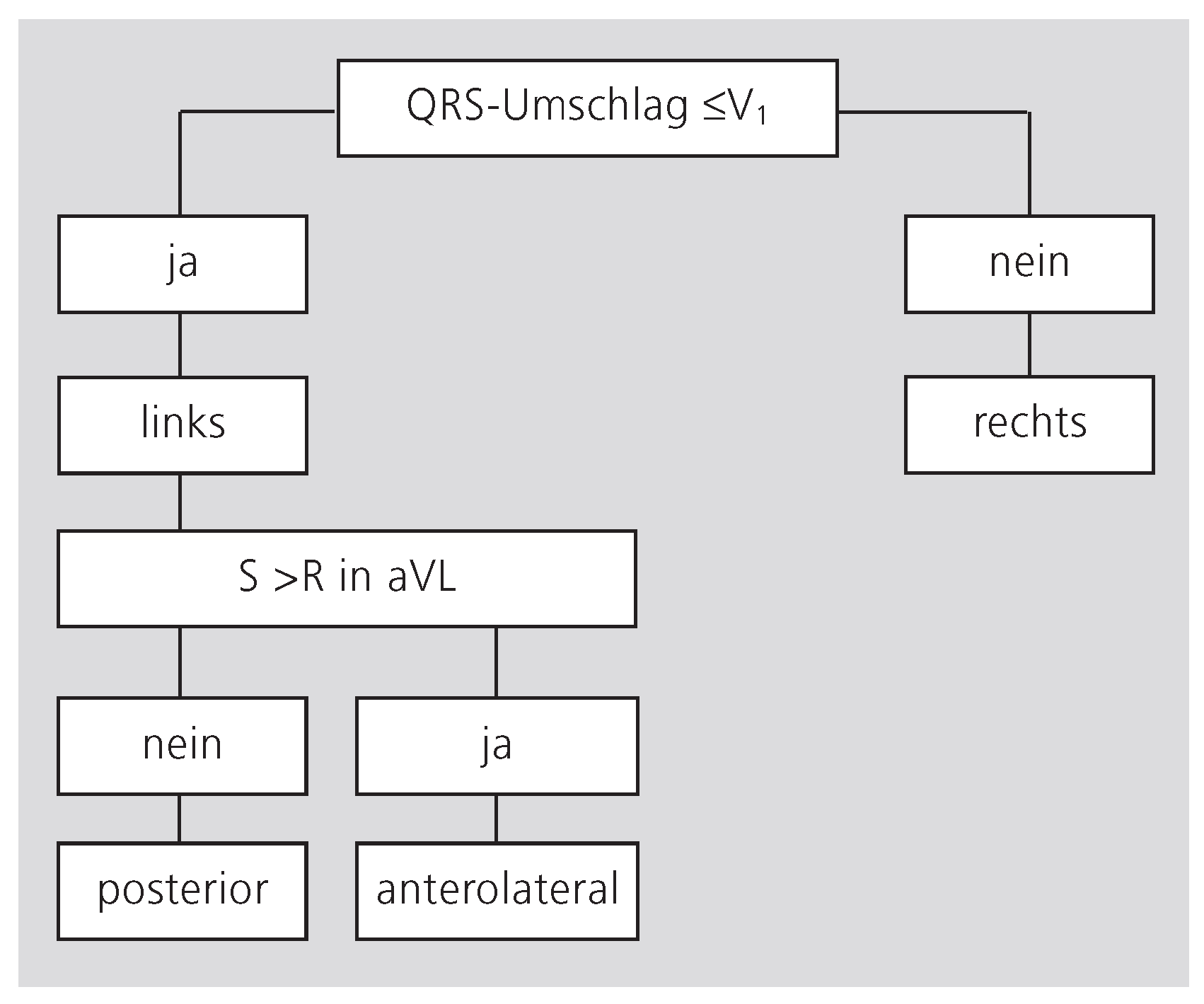 Für eine genauere Lokalisation ist der Algorithmus von Fitzpatrick [] hilfreich. Dieser nimmt allerdings den QRS-Umschlag als Referenz. Liegt dieser jenseits von V3, findet sich das Bündel rechts. Liegen in allen Ableitungen positive QRS-Komplexe vor, liegt das Bündel links. Die Sensitivität und die Spezifität des bei 93 Patienten validierten Algorithmus liegt bei 100 bzw. 97%. Eine vereinfachte Version dieses Algorithmus’ ist in Abbildung 2 dargestellt. Für die genauere Lokalisation eines rechtsseitigen Bündels und bei einem QRSUmschlag genau in V2 müssen weitere, der Übersichtlichkeit halber nicht aufgeführte Kriterien, berücksichtigt werden.