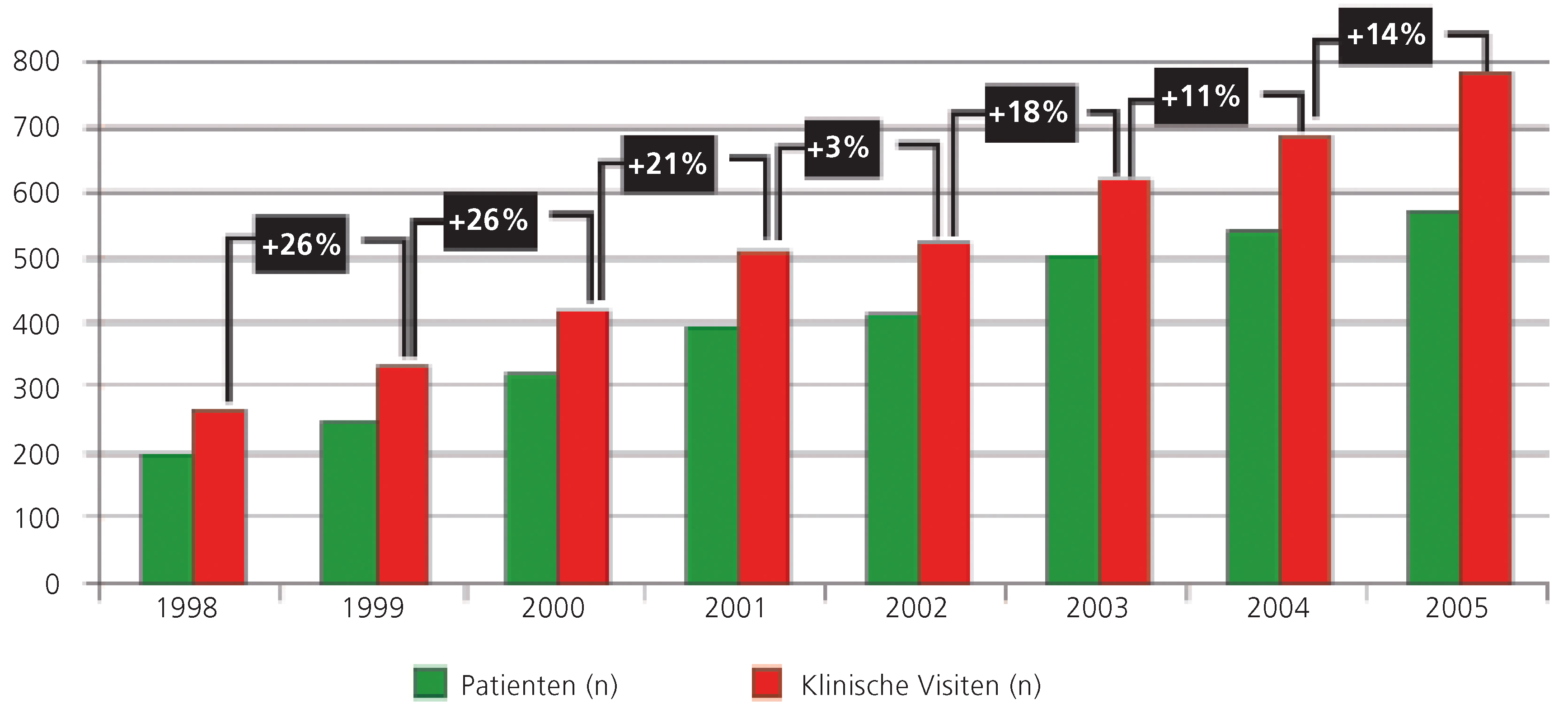 Die Population von Erwachsenen mit einem angeborenen Herzfehler ist heute grösser als jene von Kindern und Jugendlichen. Weltweit—auch in der Schweiz—wird die Anzahl Erwachsener in den nächsten Jahren weiter wachsen, während die pädiatrische Population stabil bleibt. Die rasche Steigerung der ambulanten Kontrollen am Universitätsspital Zürich reflektiert die wachsenden Bedürfnisse bezüglich struktureller und personeller Ressourcen (