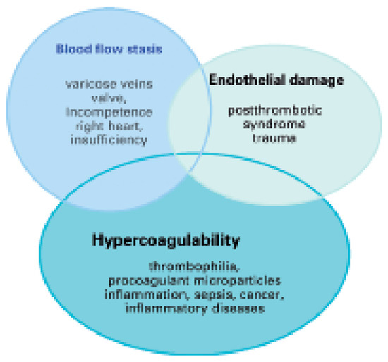 Traditionally, the occurrence of VTE is explained by Virchow’s triad which includes three conditions for the formation of thrombosis (Figure 1) [3]. Blood flow stasis is caused by ectatic venous diameters with valve incompetence as in chronic venous insufficiency or due to systemic right heart insufficiency. Vascular endothelial damage occurs after a previous thrombosis or thrombophlebitis. Blood hypercoagulability is caused by genetic or acquired thrombophilia, chronically activated states of coagulation, inflammation or infection, cell apoptosis, and cancerinduced tissue factor release [4]. In contrast to arterial thrombosis, venous thrombosis rarely occurs at sites of vascular endothelial injury; more frequently, it is triggered by activation of the coagulation system with subsequent fibrin deposition or platelet activation. Venous thrombi mostly consist of fibrin with entrapped erythrocytes and only few thrombocytes [5]. This might be the reason, why platelet inhibitors are less effective in preventing venous thrombosis than anticoagulant drugs.