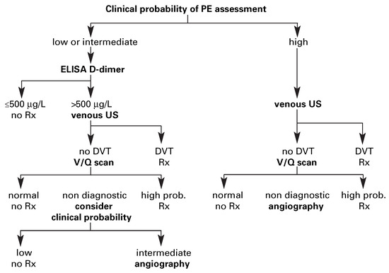 No single non invasive test has sufficient diagnostic accuracy to be used alone for diagnosing or ruling out pulmonary embolism. Therefore, modern diagnostic strategies for pulmonary embolism rely on combinations of non invasive tests such as plasma D-dimer measurement, lower limb venous compression ultrasonography, ventilation-perfusion lung scan and/or spiral CT, the results of which should be interpreted according to the clinical likelihood of pulmonary embolism. Pulmonary angiography is rarely necessary. Clinical probability of pulmonary embolism can be assessed with fair accuracy, either implicitly or by clinical prediction rules. Management studies in which patients deemed not to have pulmonary embolism are left untreated and followed up to assess their 3-month thromboembolic risk have become the benchmark for the validation of diagnostic algorithms. Haemodynamically unstable patients should be managed by quick strategies including echocardiography and ventilation-perfusion scintigraphy or spiral CT. Full article