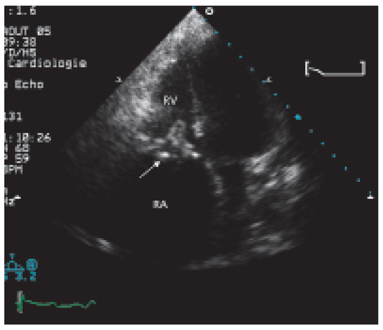 Transthoracic echocardiography (four-chamber view) shows a calcified bioprosthesis (arrow) in the tricuspid position and severe right atrial dilatation. RA = right atrium; RV = right ventricle.