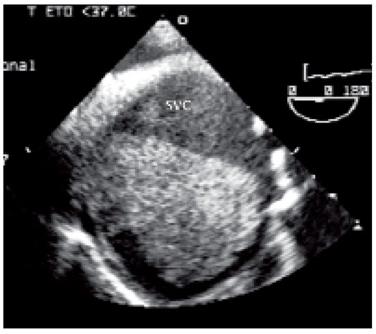 A transverse transoesophageal view shows a severely dilated superior vena cava with a large thrombus. SVC = superior vena cava.
