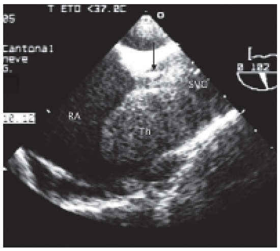 A vertical transoesophageal view of the superior vena cava. A large thrombus (Th) extends into the superior vena cava (SVC) and into the right atrium (RA) barely leaving space for the canula (arrow) inserted during surgery.