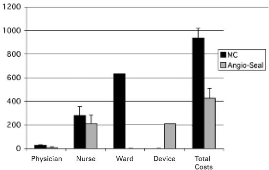 Total costs in Euro including costs of the interventional physician, nurse, and the device in patients treated with manual compression (MC) or the Angio-SealTM device for closure of the femoral arterial access after elective percutaneous coronary interventions.