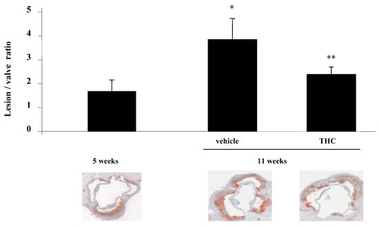 Reduced atherosclerotic plaque development and macrophage content in THC-treated apoE–/– mice. Representative cryosections of mouse aortic roots, stained for lipid deposition by Sudan IV, and quantification of atherosclerotic lesions. After 5 weeks of feeding with a high cholesterol diet, apoE–/– mice developed atherosclerotic lesions (n = 5). THC (1 mg kg–1) was orally administered during the last 6 weeks of the 11 week diet group (n = 6 for THC and n = 8 for controls). Data represent mean values ± SEM. * p <0.05 vs apoE–/– 5 weeks; ** p <0.05 vs apoE–/– 11 weeks without THC.
