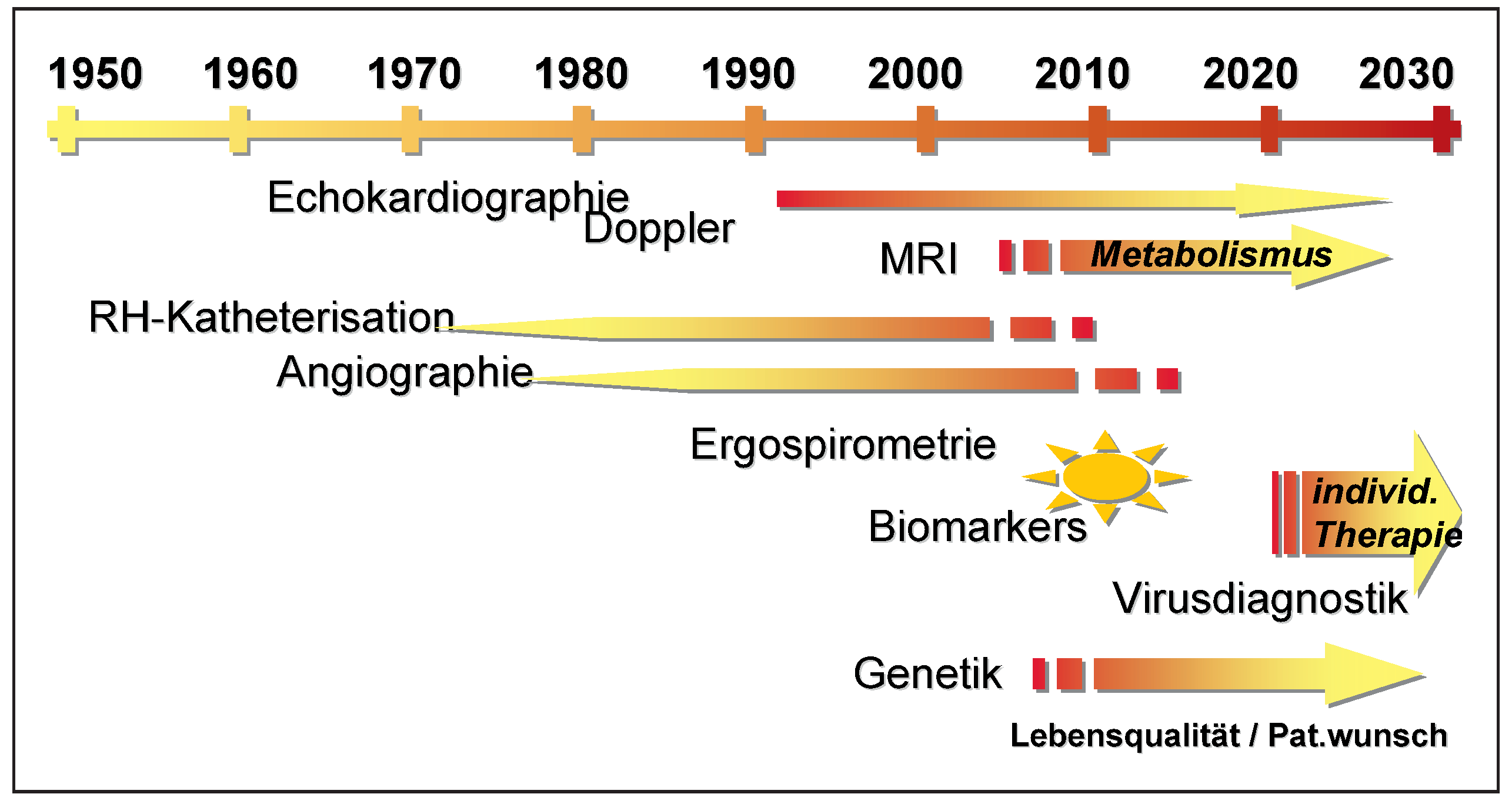 Figure 1). Während die Rechtherzkatheteruntersuchung vor allem zum pathophysiologischen Verständnis der Herzinsuffizienz beitrug, erlaubte die Echokardiographie erstmals die direkte Darstellung des insuffizienten Herzens
