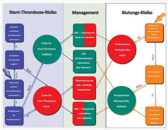 Antiplatelet therapy in form of acetyl salicylic acid (ASA) and/or thienopyridines constitutes a cornerstone in preventing thrombotic complications of coronary artery disease, including stent thrombosis after percutaneous coronary intervention. Premature interruption of dual antiplatelet therapy is one of the most important risk factors for stent thrombosis, a condition which may often be fatal. Current guidelines recommend dual therapy for at least one year after drug-eluting stents. Antiplatelet therapy is frequently stopped before invasive procedures or noncardiac surgeries because of an increased risk of bleeding complications, which may however lead to life-threatening thrombotic complications. We suggest an algorithm to assist clinicians to choose the suitable regimen for each patient after weighing the risk of stent thrombosis versus the risk of acquiring a bleeding complication. After stratifying the risk for thrombosis into «HIGH» or «NORMAL» according to given criteria, the bleeding risk is then stratified into «HIGH» or «NORMAL». Accordingly, four scenarios for the perioperative antiplatelet therapy exist: dual antiplatelet therapy should be continued perioperatively, ASA should be administered together with short-acting glycoprotein (GP) IIb/IIIa antagonists, ASA only should be continued or both drugs may be stopped. Full article