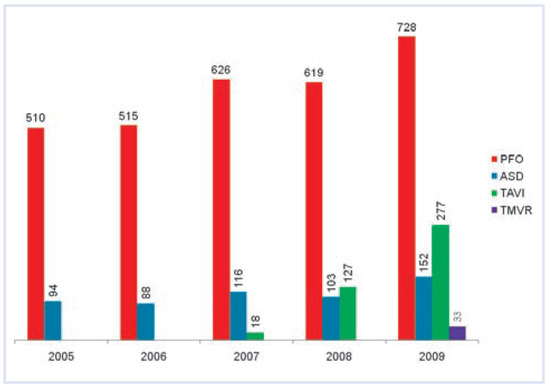 Background: Since 1987 a nationwide annual survey of percutaneous cardiac interventions has been performed in Switzerland to assess trends in type and frequency of endovascular cardiac procedures. Methods: The volume and type of endovascular cardiac procedures performed during 2008 and 2009 were collected by means of a standardised questionnaire to all adult invasive cardiac intervention centres in Switzerland. Results: The number of coronary angiographies (CA; 2008: n = 39 623; +5.7% compared to 2007; 2009: n = 41 592; +4.1%) and percutaneous coronary interventions (PCI; 2008: n = 18 099; +6.0%; 2009: n = 19024; +4.3%) continued to increase with the PCI/CA ratio remaining stable at 45.7% during the study period. After a decrease from 2006 to 2007 the proportion of drug-eluting stents (DES) remained unchanged in 2008 and 2009 (72% of stent-based PCI; 2007: 71%). Emergency PCI for ST-segment elevation myocardial infarction accounted for 20% and 18%, respectively, of PCI in 2008 and 2009 (2007: 22%). The numbers of procedures for closure of patent foramen ovale (2008: n = 619; 2009: n = 728) and atrial septal defect (2008: n = 103; 2009: n = 152) continued to increase. There was a steep increase in the number of transcatheter aortic valve implantations (TAVI; 2007: n = 18; 2008: n = 127; 2009: n = 277) and in the number of centres offering this procedure (2007: n = 1; 2008: n = 7; 2009: n = 8). In 2009, transcatheter mitral valve repair was introduced in Switzerland (33 procedures performed in three centres). Conclusions: Following a plateau in previous years, both CA and PCI procedures expanded in 2008 and 2009 in Switzerland. After a decrease in 2006, the use of DES has remained stable since and accounted for nearly three quarters of stent-based PCI. Percutaneous interventions for structural heart disease are expanding. In particular, TAVI has been rapidly adopted in Switzerland. Full article