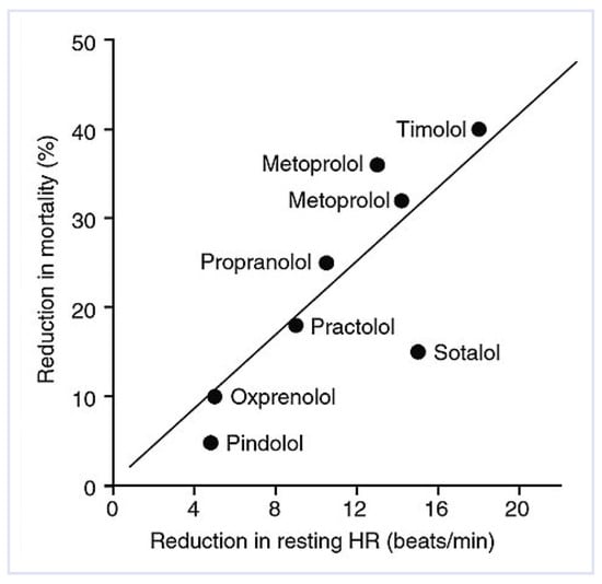 The relationship between mortality and resting heart rate with different beta-blocking drugs. A reduction in resting heart rate is associated with a reduction in mortality in patients with myocardial infarction (with permission from Böhm and Reil) [].