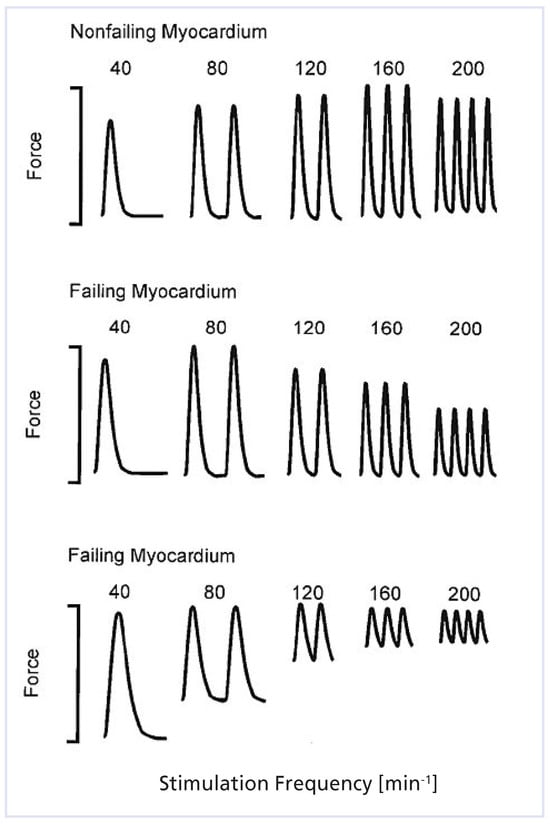 The normal heart is able to enhance the cardiac output by an accelerated heart rate or by an increase in myocardial performance. Bowditch first described this so-called force–frequency relationship in 1871 []. This force–frequency relationship (strength–interval relationship or Treppe [staircase] phenomenon) was initially observed in isolated frog hearts []. However, more recent studies have demonstrated the presence of the force–frequency relationship also in isolated myocardium of non-failing human hearts []. The term force–frequency relationship usually describes the relationship between the stimulation rate and the developed force of the myocardium, which represents the amplitude between diastolic force and peak systolic force in vitro []. Therefore, alterations in the force– frequency relationship, as observed in the failing myocardium, may result from an altered systolic and/or diastolic function (Figure 3) []. In the failing human heart, the force–frequency relationship is flattened or inversed (Figure 3) [,,]. A disturbed frequency-dependent regulation of calcium transients or a disturbed calcium sensitivity may lead to this pathological force– frequency relationship []. While in the non-failing myocardium a frequency-dependent increase in isometric force and a corresponding increase in intracellular calcium transients are observed, the inversion of the force–frequency relationship is associated with a decline of the calcium transients []. This may indicate a decreased calcium release from the sarcoplasmatic reticulum at higher stimulation rates in the failing myocardium []. Moreover, in chronic heart failure, heart rate reduction attenuates the effect of energy starvation of the myocardium [,].