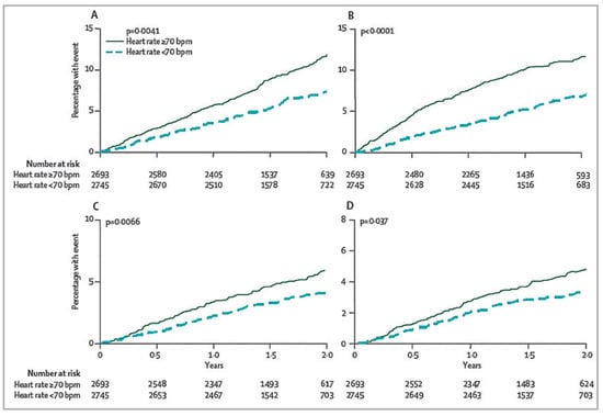 Kaplan-Meier time-to-event plots split by heart rate for (A) cardiovascular death, (B) admission to hospital for heart failure, (C) admission to hospital for myocardial infarction, and (D) coronary revascularisation. Reprinted from Fox et al. [], with permission from Elseuier.