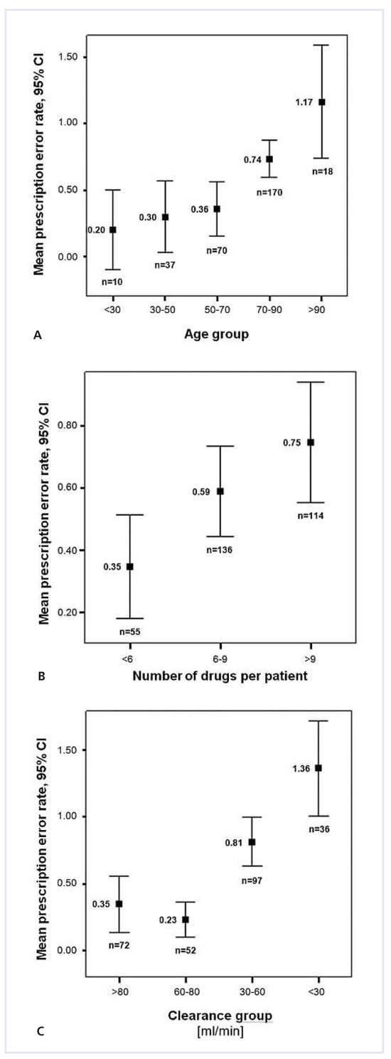Mean prescribing error rate per patient according to age (A), number of drugs (B) and creatinine clearance (C).