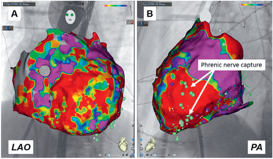 - Kumar, S.; Barbhaiya, C.R.; Baldinger, S.H.; Koplan, B.A.; Maytin, M.; Epstein, L.M.; et al. Epicardial phrenic nerve displacement during catheter ablation of atrial and ventricular arrhythmias: procedural experience and outcomes. Circ Arrhythm Electrophysiol. 2015, 8, 896–904. [Google Scholar] [CrossRef] [PubMed]