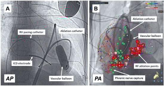 Panel A shows a fluoroscopic anterio-posterior view with the vascular balloon positioned in the epicardial space through a steerable sheath. Panel B shows electroanatomical mapping points merged with a fluoroscopic posterior-anterior view. The green dots indicate the course of the phrenic nerve. The vascular balloon is positioned parallel to the phrenic nerve. Red dots indicate radiofrequency (RF) ablation points.