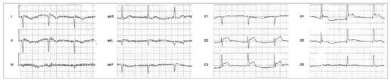 A few days after discharge, while being assessed for cardiac rehabilitation, the patient reported recurrent chest discomfort at rest. A treadmill test had to be aborted because of angina and significant ST-segment elevation, displayed in Figure 4, which were immediately responsive to nitroglycerine. Consequently, amlodipine was replaced by verapamil again and our patient has remained asymptomatic ever since. The latest follow-up examination (12 months later) showed a normal treadmill test and biventricular function on echocardiography, and no arrhythmias in the ICD interrogation.