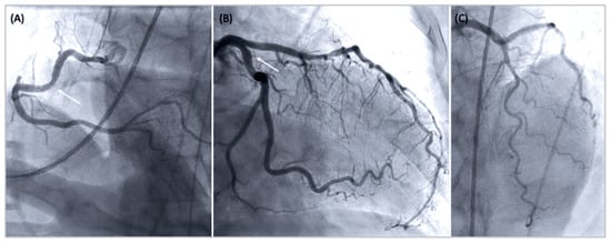 Coronary angiogram indicating mild coronary atheromatosis (arrow): (A) right coronary artery – left anterior oblique cranial projection, (B) left circumflex – right anterior oblique caudal view, and (C) left anterior descending artery – cranial projection.