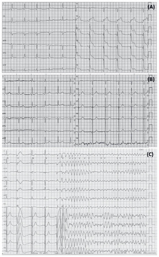 ECGs after ICU admission: (A) Initial ECG indicating ST-segment elevation (accompanied by chest pain), (B) normal ECG during a pain-free period, and (C) Renewed ventricular fibrillation after episode of chest pain on ICU.