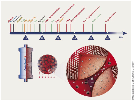 In contrast to dialysis where water, small molecules, and hydrophilic substances such as urea, ammonia, or electrolytes are removed via a semipermeable film (approximately 1.5 m2), the CytoSorb® device is based on the concept of adsorption. Adsorption is a process capable of attracting solid substances to a surface. Therefore, adsorption can remove a range of substances that conventional dialysis cannot. Hemoadsorption by CytoSorb® can remove hydrophobic substances up to 60 kDa, depending on concentration.