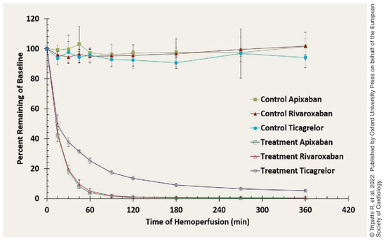 Percent removal of ticagrelor, rivaroxaban, and apixaban. Results represent mean ± standard deviation, n = 5, [11].