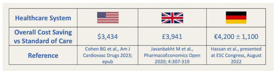Since all clinical studies to date have shown significant reductions in the need for revisions due to bleeding, transfusions, and duration of hospital stay, two publications have reported on the cost-effectiveness of intraoperative hemoadsorption. Moreover, a study from Hamburg, Germany, compared the economic effects of intraoperative hemoadsorption in ACS patients (n = 72) with former patients (n = 22) without intraoperative hemoadsorption by bootstrap analysis [26]. They resulted in cost savings of 4.200 ± 1.100 euros. A cost-utility analysis from the United Kingdom (UK) by Javanbakht et al. evaluated CytoSorb® for the intraoperative removal of ticagrelor compared to standard care in patients undergoing emergent or urgent cardiac surgery [19]. The authors showed that intraoperative removal of ticagrelor by CytoSorb® could save about 4,000 pounds over a 30-day time period due to less consumption of blood products, lower rethoracotomy rates, and a shorter length of stay in the emergency surgical setting. The National Institute of Health Care Excellence in the UK published advice on the use of intraoperative hemoadsorption in cardiosurgical cases under antithrombotics (https://www.nice.org.uk/ad-vice/mib249). In addition to this, a recently published paper estimated the cost-effectiveness and budget impact of using CytoSorb® intraoperatively compared to standard practice for reducing the risk of perioperative bleeding during and after CABG surgery from the healthcare sector’s perspective in the United States of America (USA). The authors interpreted the results both as incremental cost-effectiveness ratios and as net monetary benefits at a distinctive cost-effectiveness threshold of 100,000 United States dollars (USD) per quality-adjusted life year (QALY). The authors showed that the intraoperative use of CytoSorb® was superior for all evaluated cohorts. Patients with less than 24 hours of preoperative washout in the device arm gained a total of 0.017 QALYs combined with savings of 1748 USD, for a net monetary benefit of 3434 USD. Based on their probabilistic sensitivity analyses, the intraoperative use of CytoSorb® had a 91% likelihood of being superior for patients with less than 24 hours of washout and a 99% likelihood of being cost-effective at a 100,000 USD/QALY threshold. Cohen et al. concluded that intraoperative hemoadsorption is a superior strategy compared with standard therapy for CABG patients on ticagrelor with less than two days of washout time. Hence, this novel and innovative device could easily be used for cardio-surgical patients on ticagrelor treatment to provide better clinical outcomes with lower overall healthcare costs [20]. Figure 6 exemplifies the cost savings published so far from three different international analyses [19,20,26].