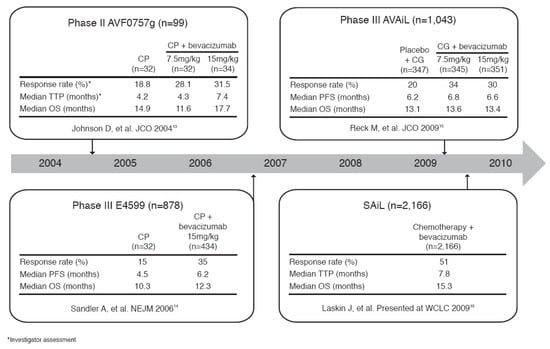 - Laskin, J.; Crinò, L.; Tsai, C.; et al. MO19390 (sail): first-line bevacizumab-based therapy in advanced non-small cell lung cancer (nsclc)—outcome by chemotherapy regimen [abstract C2.5]. J Thorac Oncol 2009, 4 (Suppl S1), S359. Available online: http://journals.lww.com/jto/toc/2009/09001 (accessed on 12 February 2010).