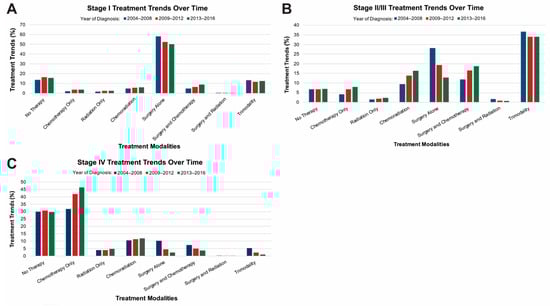 For patients with stage IV disease during this 13-year time period, there was a trend towards increased receipt of chemotherapy from 31.8% (2004–2008) to 46.4% (2013–2016). Overall surgical treatment declined over the years for stage IV disease in all four categories; surgery alone, surgery plus chemotherapy, surgery plus radiation, and trimodality (Figure 1C).
