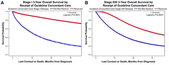 Regardless of stage, patients that received guideline concordant care had significantly improved three-year OS compared to patients that did not receive guideline concordant care. Patients with Stage I disease (Figure 3A) had a three-year OS of 74% if they received guideline concordant care compared to a 20% three-year OS rate if they did not receive guideline concordant care (p value < 0.0001). For patients with stage II/III disease (Figure 3B) who received guideline concordant care their three-year OS was 47% compared to 20% three-year OS for those who did not receive guideline concordant care (p value < 0.0001).