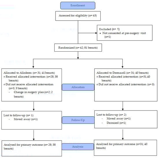 Eligible and consenting patients were randomized by the CRA using a web-based program developed by the Ottawa Methods Centre. Patients were randomized 1:1 to either Alloderm-RTU or DermACELL using a permuted variable block design with block sizes of 4 and 6, with no stratification factors. The randomization was at the patient level. Patients who were undergoing bilateral mastectomy and bilateral immediate implant reconstruction were randomized to the same type of ADM for each breast, and data on each breast collected. The plastic surgeon was informed of the randomization arm on the day of surgery, immediately before the procedure and both Alloderm-RTU and DermACELL were available in the operating room. All the breast oncologic (AA, EC, AR) and reconstructive (JZ, SF, MM) surgeons at the institution were involved in the study. The oncologic surgeons performed nipple or skin-sparing mastectomies; while the plastic surgeons performed the immediate implant reconstruction.