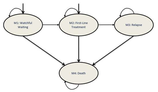 The model was composed of four health states: WW, first-line treatment, relapse and death. Patients could start in either the WW or first-line treatment states. It was assumed that 85% of patients would enter the model in the WW state, as determined by Chen et al., because the majority of patients with a new diagnosis of CLL do not require immediate treatment []. Once patients failed to respond to first-line treatment, they entered the relapse health state. After failure to a second-line treatment, patients entered a sub-health state of relapse, in which their disease progressed but death had still not occurred (palliative state). The possibility of death existed for patients from all health states. Patients within the model were not allowed to revert to previous health states. Cycle length was 28 days over a total time horizon of 15 years.