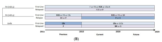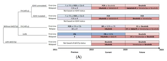 Although CIT regimens were the standard first-line treatments for patients with CLL for many years, oral targeted therapy (OTT) has recently emerged as an alternative treatment option. The combination of chlorambucil and obinutuzumab is considered the standard CIT treatment for CLL patients unfit and/or older than 65 years old [], while the standard CIT regimen for young fit patients is a combination of fludarabine, cyclophosphamide and rituximab (FCR), a regimen that has been shown 3-year progression-free survival (PFS) in 64.0% of patients []. The development of OTT has led to substantial advancements in treatment options for CLL, first in the relapse setting in which ibrutinib was first approved in 2015, and later in previously untreated patients. A second OTT, idelalisib, in combination with rituximab, was also approved for the treatment of patients with relapse/refractory CLL but is used infrequently due to adverse events. Oral targeted therapy finds its advantage over CIT not only in superior efficacy, but also through easier administration and reduced hematological toxicity because of its specific targeted mechanism of action. In clinical trials, OTT has shown significant improvement over CIT in PFS, particularly in patients with del(17p) and umIGHV. Thus far, an overall survival advantage of first-line OTT has been seen only in the subgroup of young and fit patients and not in the majority of patients with CLL, who are older or unfit [,,]. This improved efficacy and ease of administration are leading the way for the approval and use of other therapies in the near future.
