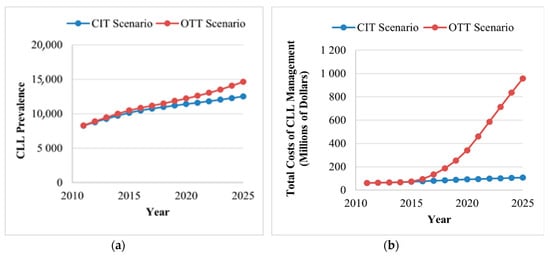 As incidence rates and rate of survival are increasing, the prevalence of CLL in Canada is projected to increase 1.8-fold, from 8301 patients in 2011 to 14,654 by 2025, in the OTT scenario. However, if CIT remains the standard of care, the total number of CLL cases by 2025 is projected to be slightly lower, from 8248 in 2011 to 12,521 in 2025, an estimated 1.5-fold increase (Figure 3A).